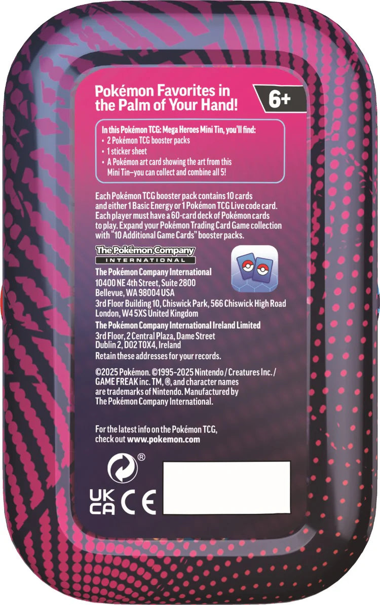 Cada Pokémon TCG: Mega Heroes Mini Tin contiene: